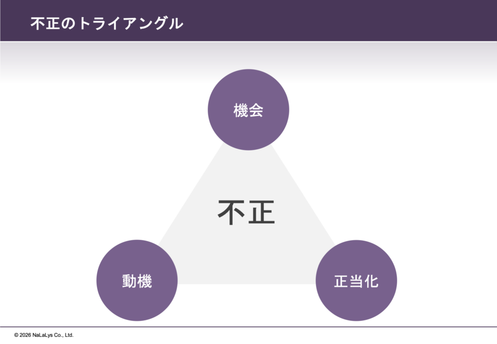 - 従業員が不正を必要な行為であると正当化すること