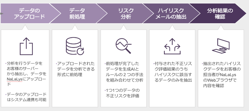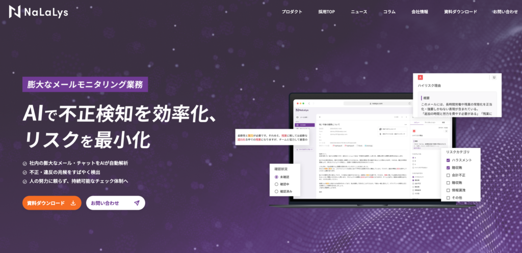 「監視力を強化したい」「工程の見える化を実現したい」という方は、NaLaLysへご相談ください。NaLaLysでは、膨大なメール・音声・チャットをAIで検知するサービスを提供。