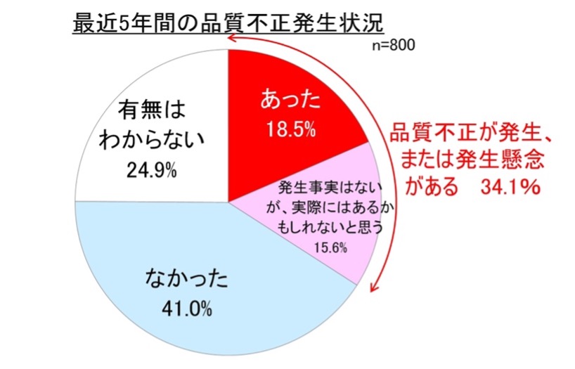品質不正にさまざまな種類があることを理解したところで、実際に品質不正がどのくらい起こっているのか、発生状況を確認しておきましょう。