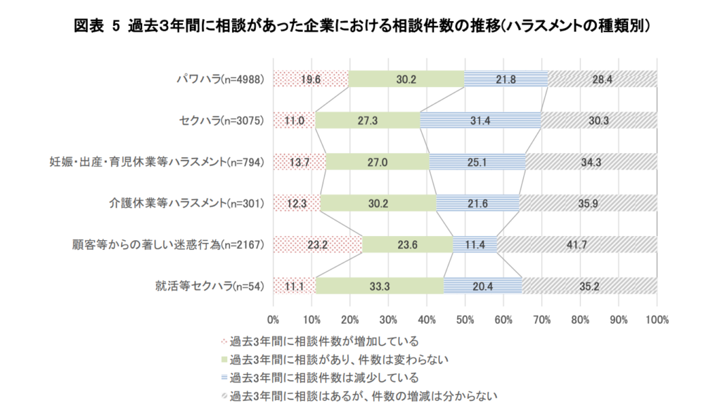 ただし、顧客などからの迷惑行為(いわゆるカスハラ)については、「増加している」と回答した割合が「減少している」を上回っているなどハラスメントの種類によって状況はさまざまです。