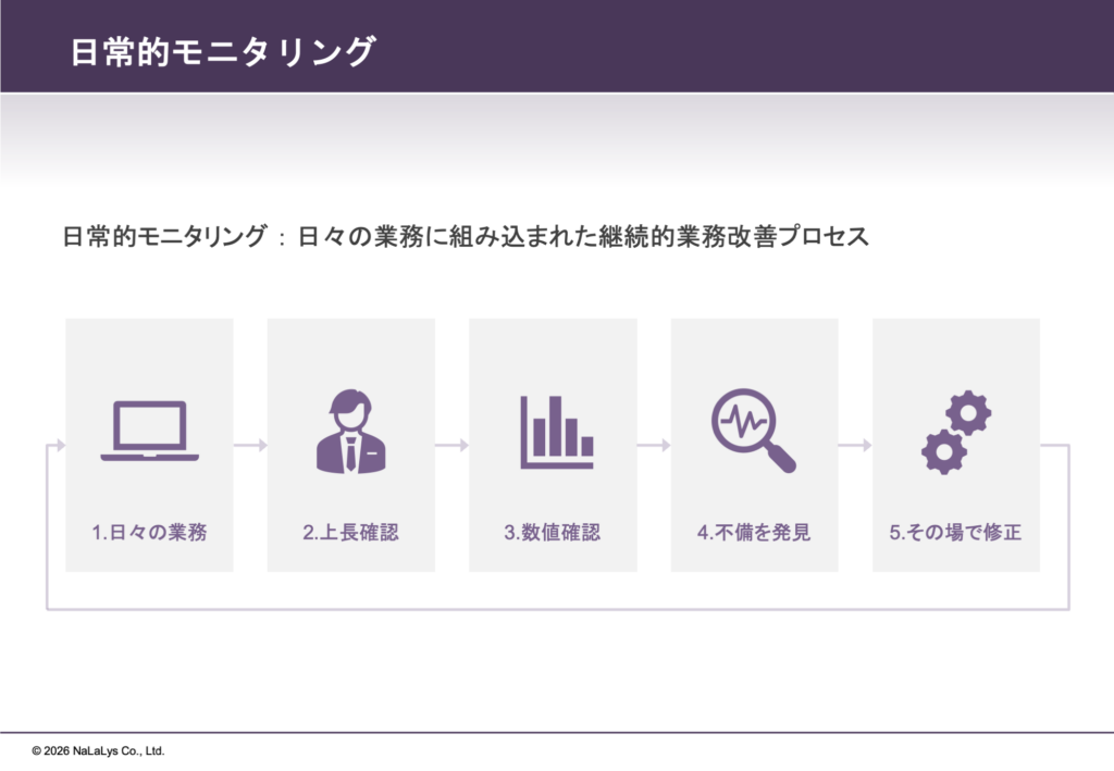 | 日常的モニタリングの組み込み | ・日常的モニタリングが業務活動に適切に組み込まれているか |