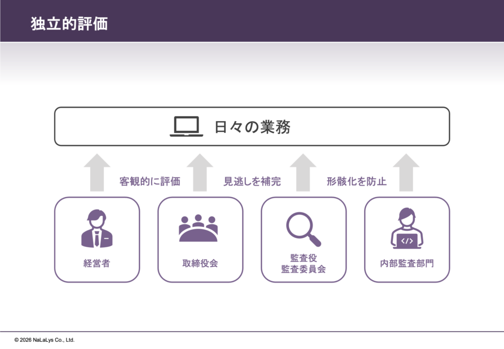 このように、独立的評価は単なるチェックにとどまらず、組織全体の統制の質を高める重要な役割を果たしています。