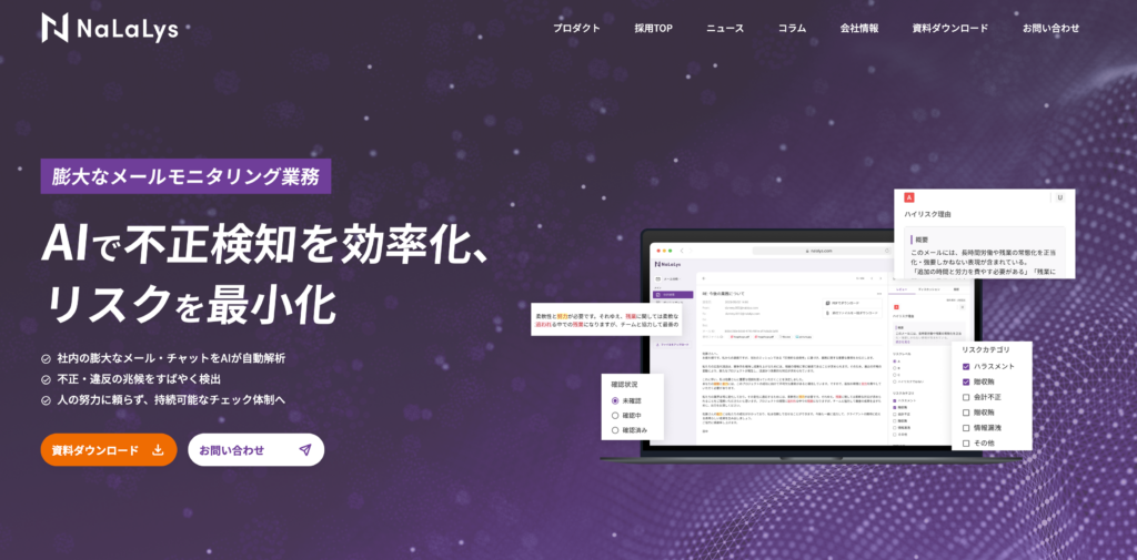 NaLaLysは、内部統制におけるモニタリングの効率化に活用できるツールです。メールやチャットなどのコミュニケーションデータをAIが分析し、リスクの高いやり取りを自動で抽出することで、効率的にモニタリングを行うことができます。モニタリングを形だけで終わらせず、実務で機能させたいと考えている方は、ぜひ導入を検討してみてください。